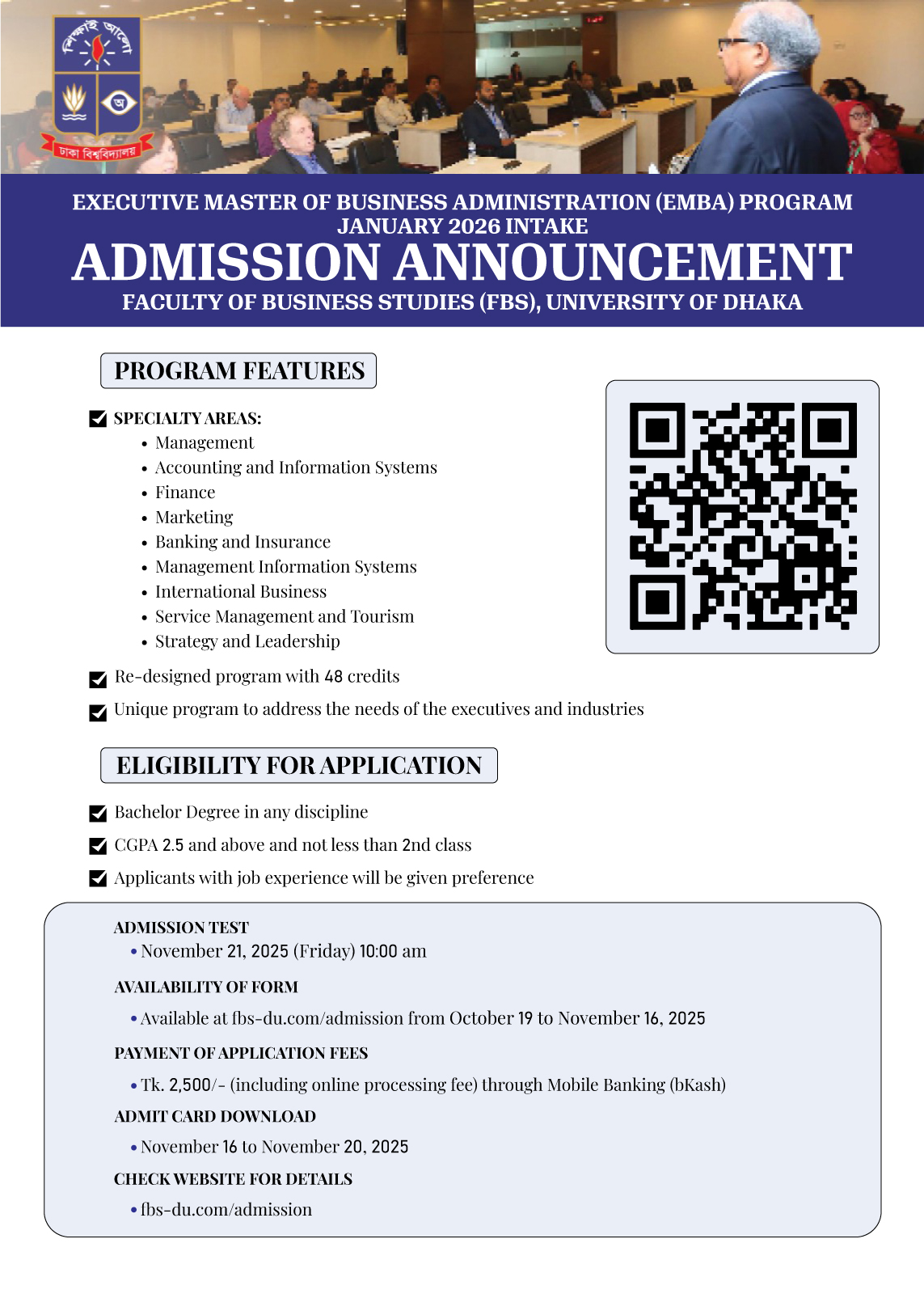 The FBS EMBA at the Faculty of Business Studies, University of Dhaka, is NOT just for executives. It’s a flexible, evening-time MBA designed for fresh graduates and early-career professionals who want to: